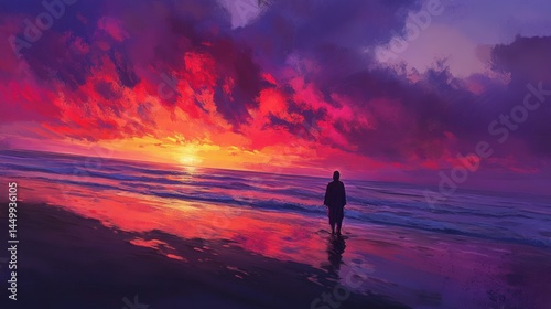 sunset, beach, ocean, sky, cloud, person, silhouette, water, sand, horizon, wave, seascape, coast, shore, red, purple, orange, twilight, evening, calm, serene, peaceful, tranquil, solitude, contemplation, meditation, lone, figure, art, digital, painting, illustration, artwork, dramatic, vibrant, colours, beauty, nature, scene