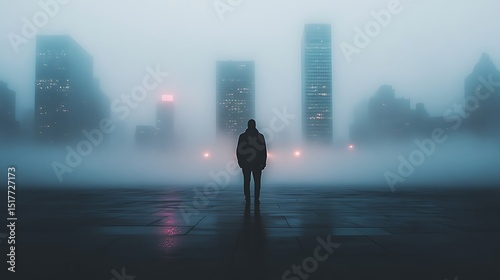 Solitude in Dense Fog: A Silhouette Contemplating the Urban Mystery