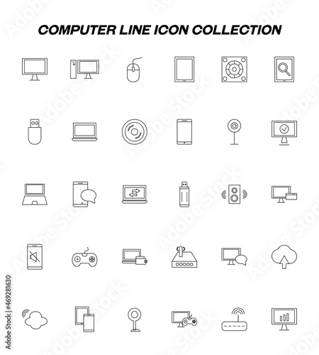Сomputer technology concept. Line icon set icluding computer, laptop, pc, mouse, router, tablet, speaker, flash card, cd, web camera, mobile phone, joystick etc