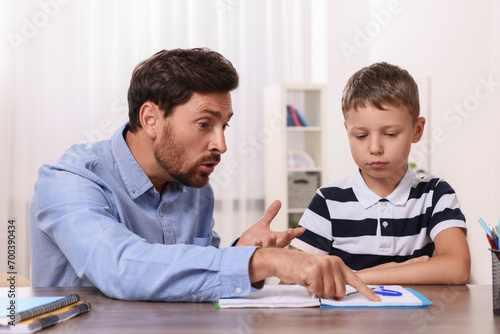 Son studying with annoyed father at table in room. Suffering from dyslexia