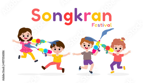 Songkran festival banner template kids holding water gun and jumping enjoy splashing water in Songkran festival, Thailand Traditional New Year's Day Vector Illustration isolated background