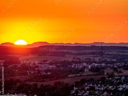 sunset, countryside, horizon, far, evening scene, sun, orange, mountain chain, energy, tree, heaven, cloudy sky, cloud, firmament, weather, climate, twig, twig, field, field, view, power pole, countryside