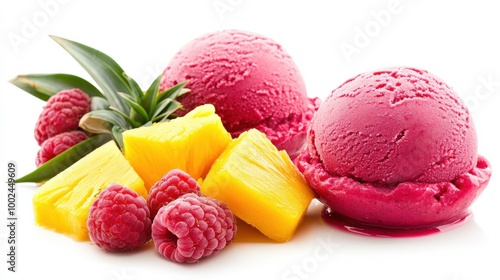 sorbet, raspberry, mango, pineapple, fruit, fresh, ice cream, ball, isolated, pink, cold, three, food, dessert, ice, white background, delicious, scoop, yellow, various, decorated, tasty, colourful, closeup, gelato, summer, vegan, juice, white, diet, natural, healthy, creamy, vegetarian, fruity, berry, sweet, homemade