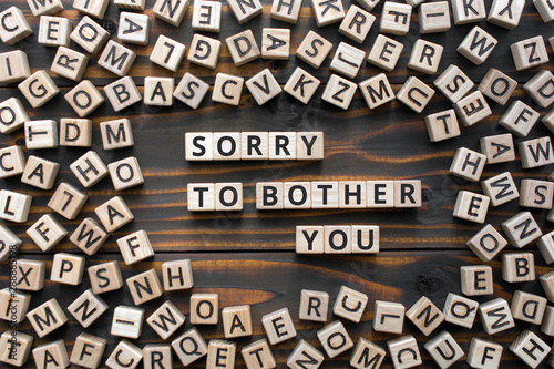 Sorry to bother you - phrase from wooden blocks with letters, Excuse for troubling concept, random letters around, white background