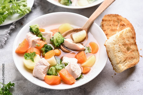 chicken, soup, vegetable, healthy, diet, cooked, carrot, meat, hot, broccoli, potato, dish, meal, bowl, herb, food, onion, plate, green, white, broth, tasty, lunch, chicken breast, first, fresh, liquid, orange, dinner, boiled, closeup, epicure, cookery, portion, homemade, colourful, slice, delicious, nourishment, eat, receipe, table, bread, toast, spoon, organic, natural