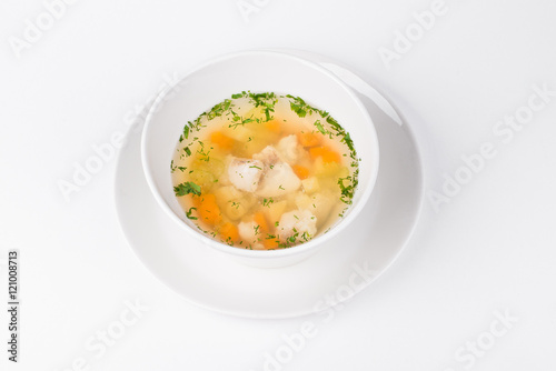 Soup of the Lake walleye with fish and carrot in white bowl