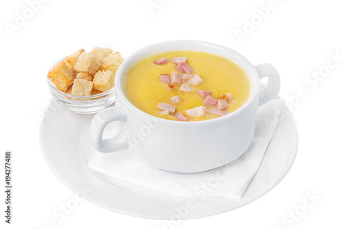 Soup puree, cream soup yellow with ham and croutons, dry bread. On a napkin in a white plate isolated white. Serving dishes in a cafe, restaurant, for a menu. Side view