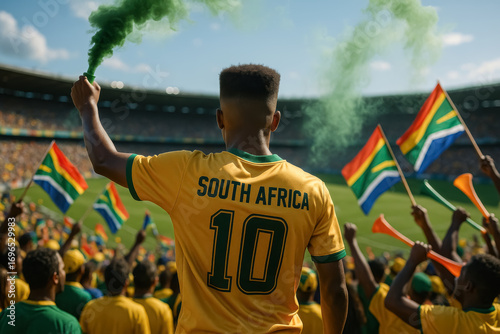 south, africa, soccer, fan, supporter, stadium, celebration, male, man, young, dark, skin, short, hair, yellow, jersey, flare, smoke, cheer, sport, football, crowd, team, national, culture, oneness, passion, energy, identity, excitement, event