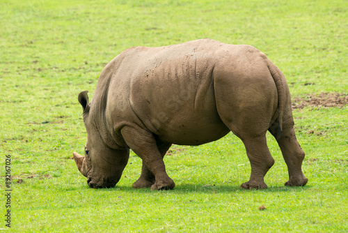 Southern White Rhino or Rhinoceros with oxpeckers in National Park