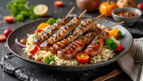 cookery, culinary, eatery, epicure, food, presentation, detail, vibrant, decor, no people, skewer, grilled, colours, intricate, delicious, rice, vegetable, sauce, bright, dining, modern, plating, creativity, herb, freshness, black, background, closeup, meal, ingredient, serving, feast, favor, green, orange, tomatoes, pepper, hospitality, appetising, visual, life events, inspiration, 1, food photography