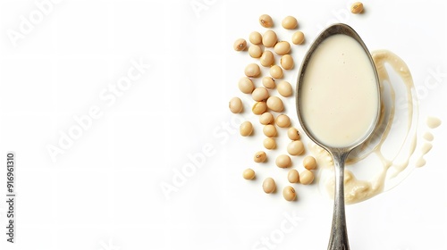 Soy milk in a spoon with isolated soybeans on a white backdrop. Generative Ai