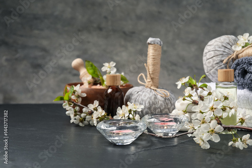 Spa composition with cosmetic products, burning candles and beautiful flowers on black textured table against gray background