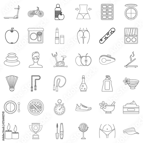 spa, icon, outline, vector, illustration, set, collection, signs, object, logotype, symbol, isolated, 36, black, line, thin, woman, apple, bottle, fruit, food, mirror, trophy, award, health, beauty, bicycle, mascara, constructed, up, shoe, powder, brush, rope, jumping, lipstick, clock, fan, cream, burger, bowl, treadmill, candle, fire, flask