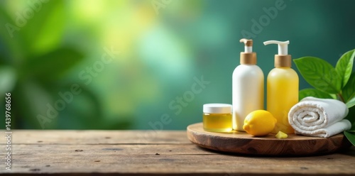 Spa products arranged on rustic wooden table, soft-focus bathroom setting, clean, oils