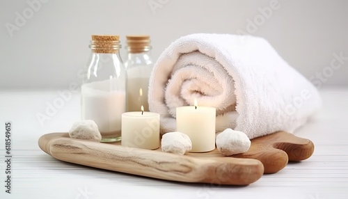 Spa towels with stones and candles on a white background, wood board, fluid and organic. Generative AI