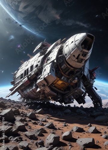 Space debris scattered around a crashed spaceship, crash site, fragments