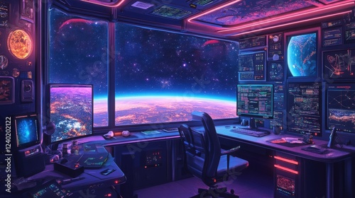 Space Office - An office space on a futuristic space station, with a breathtaking view of Earth and distant galaxies