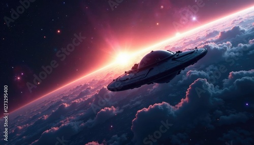 Spacecraft exploring vast galaxy scene with starlight, astronomical objects, nebulas, space exploration