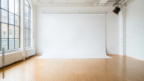 Spacious empty white room with wooden floor and large window, inviting creativity and endless possibilities.