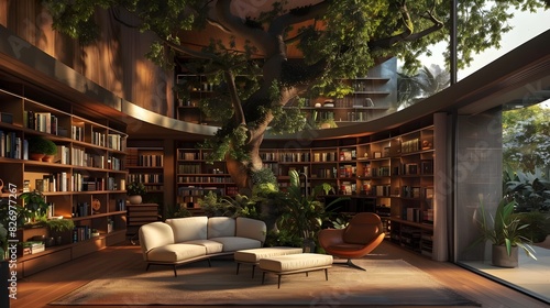 home, library, interior, roomy, tree, chair, bookshelf, book, plant, lighting, ambient, reading, comfortable, greenery, study, cognition, calmness, private, sanctuary, literature, relaxation, education, personal, growth, oasis, collection, culture, wooden, decor, sustainable