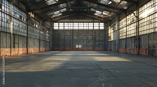 Spacious Industrial Warehouse Interior with Concrete Floors and Large Windows : Generative AI