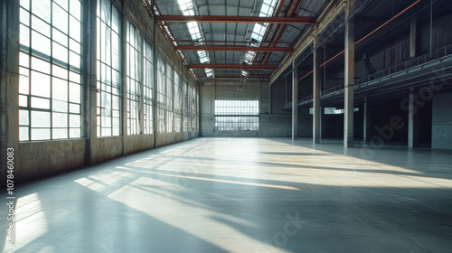 warehouse, industrial, space, empty, building, concrete, floor, high, ceiling, panoramic, window, loading, area, unloading, clean, uncluttered, daylight, soft, lighting, versatile, design, roomy, interior, architecture, commercial, storage, facility, logistic, style, minimalism, surface, open, modern, aesthetic, natural, light, shadow, functionality, flexible, layout, urban, simplistic, bright, environment, large