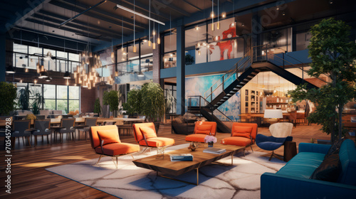 Spacious modern loft-style office space with open floor plan, lots of pendant lights, green plants, grand staircase, bright orange chairs, high ceiling, natural light . Architectural Solutions