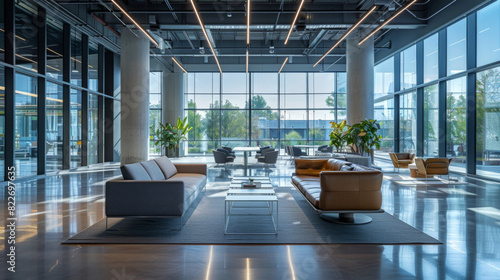 Spacious, modern office lobby with large windows letting in natural light, contemporary furniture, and a welcoming atmosphere.