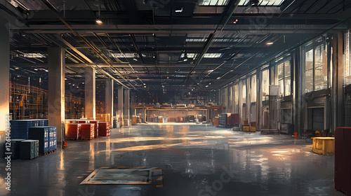 Spacious warehouse interior with empty loading docks and polished concrete floors. Interdimensional Marketplaces. Illustration