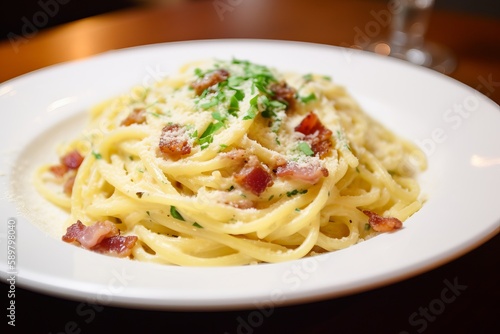 spaghetti carbonara in an italian restaurant, ai generated, Generative AI