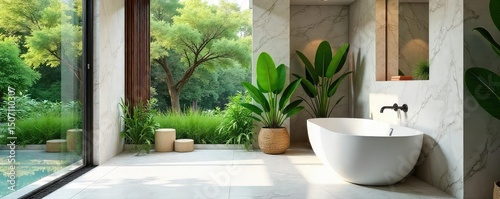 Spa-like bathroom retreat, featuring a freestanding tub, marble accents, and lush greenery Perfect for relaxation and rejuvenation Ideal for home d?cor and interior design blogs , decor, greenery