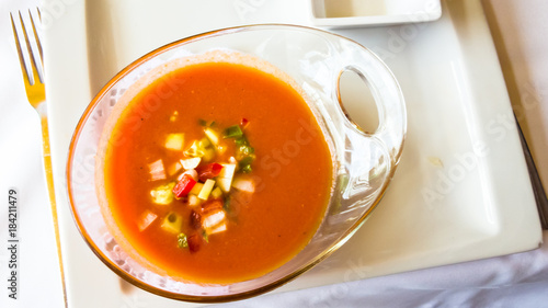 Spanish tomato gazpacho soup in the plate.