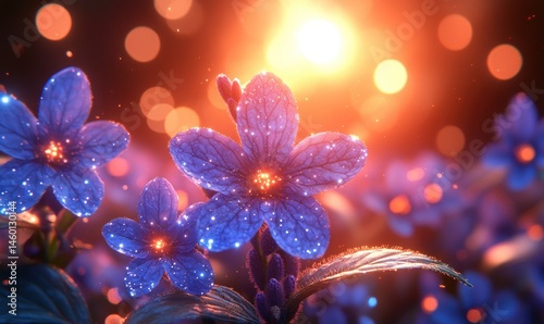 flower, blue, flower, sparkle, sparkling, sunset, warm, light, glow, magical, mystical, nature, beauty, flower petals, blossom, bloom, plant, vibrant, colours, artistic, digital, art, image, photo, background, scene, design, graphic, illustration, fantasy, dreamy, romantic, serene, peaceful, calmness, delicate, intricate, detail, texture, bokeh, light, dark, night, summer, spring, closeup, macro, wallpaper, screen