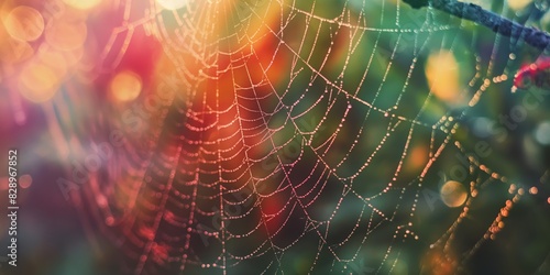 Sparkling dew drops adorn a spider web, illuminated by sunlight creating a bokeh effect in the background