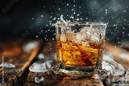 Sparkling drink splashing in glass with ice on wooden table in cozy setting