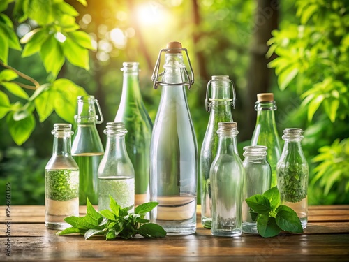 Sparkling glass water bottles of varying shapes and sizes stand upright on a rustic wooden table, surrounded by