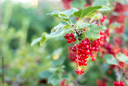 Sparkling in summer sun bunch ripe juicy red currant berries, hanging from branch. Background is blurred