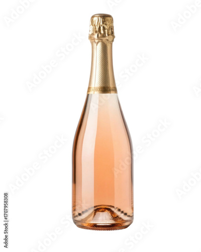 Sparkling rose wine bottle with golden foil cap, showcasing beautiful gradient from light pink to clear. Perfect for celebrations and special