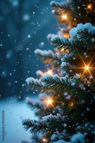Sparkling snowflakes fall gently on a bright Christmas tree, sparkling snow, snowfall