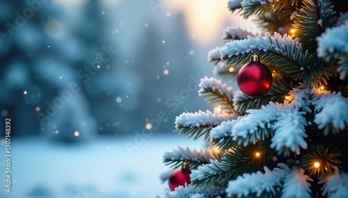 Sparkling snowflakes fall on a fluffy white Christmas tree, frosty, tree