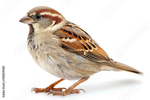Sparrow hopping forward tiny claws barely touching ground delicate feathers ruffled mid motion isolated on a white background