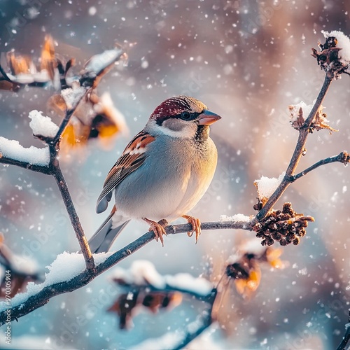sparrow, cold weather, snowscape, migratory bird, winter landscape