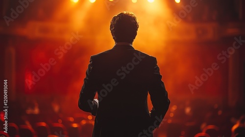 stage, spotlight, man, suit, crowd, performance, audience, theatre, auditorium, show, speaker, presenter, concert, event, light, dark, silhouette, back, standing, alone, 1, single, dramatic, sharpened, attention, anticipation, hope, expectation, mystery, future, vision, light, shadow, background, red, orange, gold, bright, brightly, coloured, large, presentation