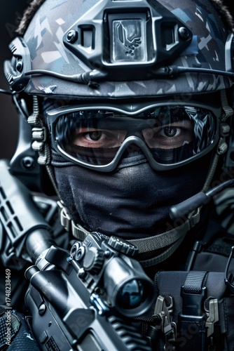 soldier, special forces, military, army, combat, service, uniform, helmet, goggles, rifle, weapon, firearm, mask, balaclava, war, defense, protection, security, swat, commando, law enforcement, operator, armed, ready, vigilant, focused, determination, strength, power, challenge, danger, threat, conflict, crisis, mission, operation, intelligence, professionalism, training, action, closeup, portrait, head shot, front view, adult, person, human