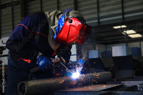 Specialist welder weld construction frame, welding spark , welder wearing full PPE to weld pipe