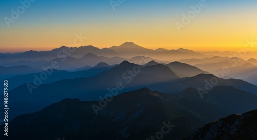 mountain, landscape, sunset, golden hour, mountain chain, silhouette, blue, orange, sky, mist, haze, scenic, nature, peaceful, serene, peak, outdoors, alpine, elevation, panorama, gradient, horizon, atmosphere, dawn, twilight, aerial view, huge, remote, natural beauty, exploration, travel, wilderness, majestic, beauty, calmness, vibrant, calm, earth, colours, composition, light, shadow, texture, layer, topography, environment, adventure, geography, visual