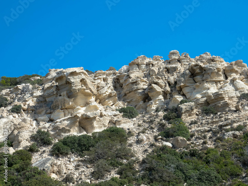 Spectacular panorama view of the bizarre rock formation on top of the Attavyros mountain. The highest mountain on the island of Rhodes. Embonas, Rhodes Island, Greece. Plenty space for text.