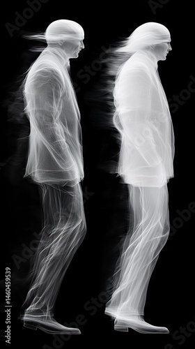 ghost, spirit, figure, transparent, walking, aethereal, silhouette, man, person, withering, motion, abstract, white, black, shadow, light, surreal, mystery, illusion, energy, aura, phantom, cadaver, afterlife, death, soul, existence, human, impression, image, concept, profile, side, movement, form, shape, blurred, trail, ghostly, passing, departure, leaving, vanishing, dissolving, transformation, memory, past, transition