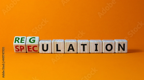 Speculation or regulation symbol. Turned cubes and changed the word speculation to regulation. Beautiful orange table, orange background, copy space. Business, speculation or regulation concept.