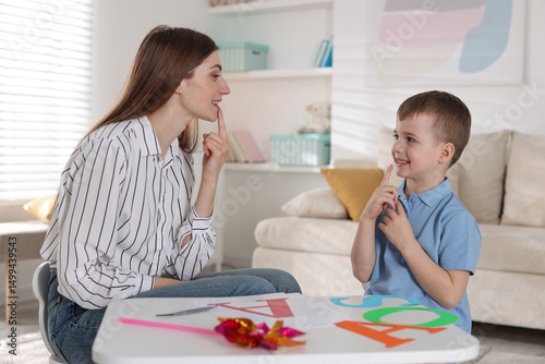 Speech therapist working with little boy indoors